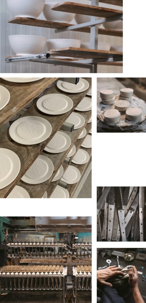 De l’emboutissage sur des presses impressionnantes, à la gravure et au polissage des couverts en inox, réalisés par des gestes assurés, tout comme les nombreuses étapes avant la première cuisson, de l’émaillage des pièces « dans le blanc » avant leur décoration « à la main » pour la vaisselle en or blanc.
