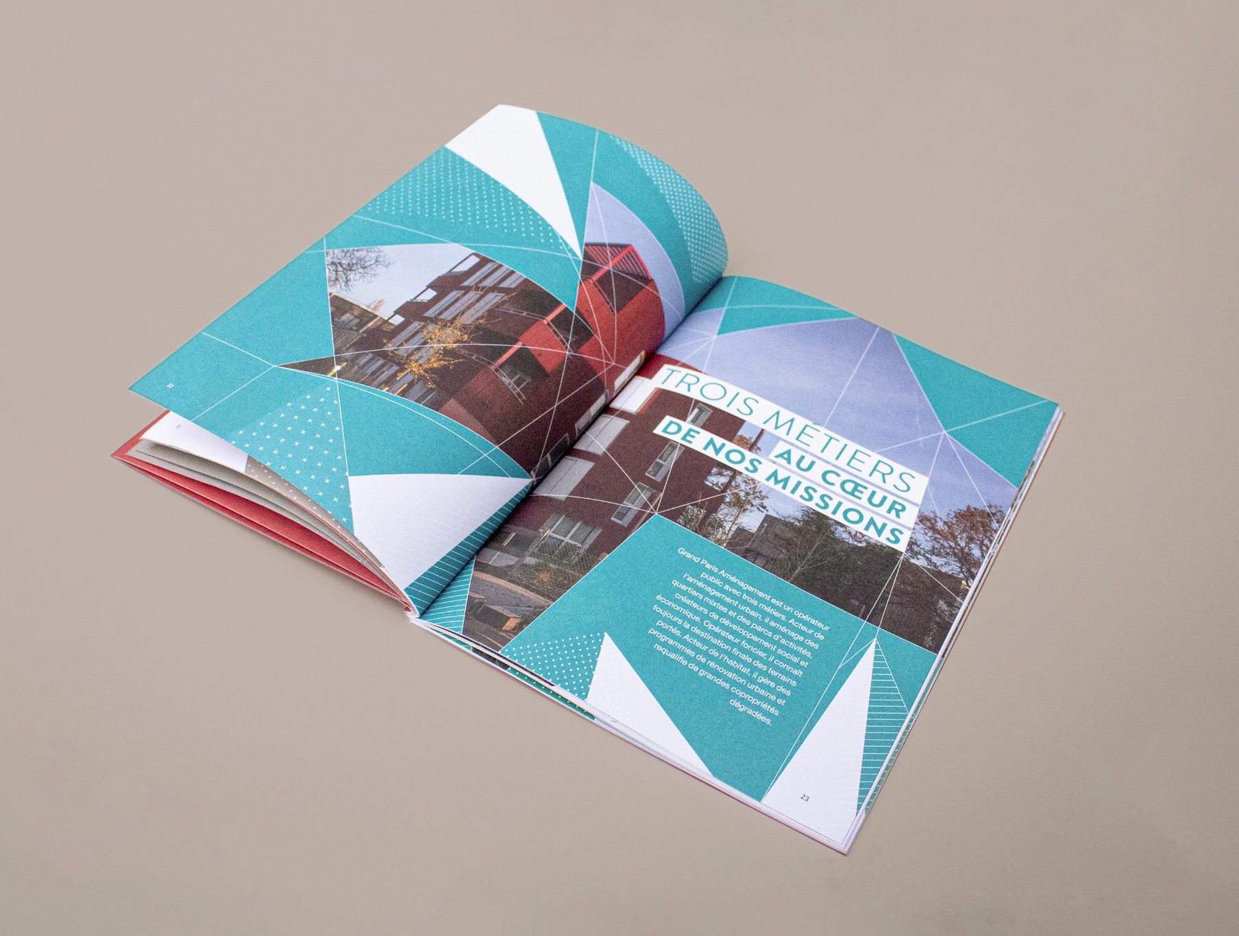 Dans le prolongement des fondamentaux de sa charte graphique constitués de lignes construites en « low poly », offrant un effet de relief en associant des polygones et en jouant avec les nuances de couleurs, nous avons pris le parti de les étirer et de les étendre à l’ensemble de la maquette pour transformer de manière agile et responsive chaque double-page du rapport.