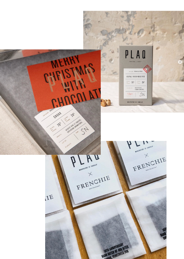 PLAQ est une toute jeune manufacture de chocolat encore au berceau mais qui ne devrait pas tarder à se tenir debout, à l’échelle de son identité visuelle toute en verticalité ! Droite comme l’est aussi l’exigence de tout amateur de chocolat qui se respecte. Et droite comme le circuit de fabrication qui cultive le « bean to bar » ou autrement dit : de la fève à la tablette, sans intermédiaire.